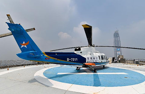 Photo taken on Aug 7, 2015 shows a helicopter of Astro Air sitting parked on the top of an office building in downtown Shenzhen, South China's Guangdong province.