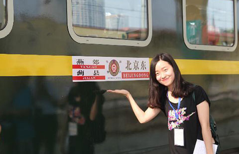 A passenger poses for photo beside a train of the newly-opened intercity rail line linking Beijing and Jixian county of Tianjin, at Beijing East Railway Station in Beijing, capital of China, July 10, 2015.
