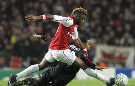 AC Milan survived an almighty scare against a rejuvenated Arsenal to scrape into the Champions League quarter-finals 4-3 on aggregate on Tuesday despite being thrashed 3-0 by the London side.